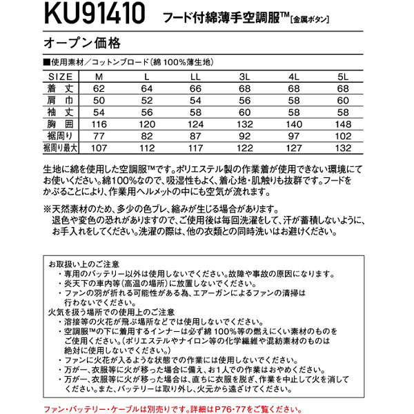 お取扱い上の注意 専用のバッテリ—以外は使用しないでください 故障や事故の原因になります 炎天下の車内等(高温の場所)に放置しないでください ファンの羽が折れる可能性がある為 エアーガンによるファンの清掃は行わないでください この商品は火気を扱う現場では着用しないでくださいお取扱い上の注意 専用のバッテリ—以外は使用しないでください 故障や事故の原因になります 炎天下の車内等(高温の場所)に放置しないでください ファンの羽が折れる可能性がある為 エアーガンによるファンの清掃は行わないでください この商品は火気を扱う現場では着用しないでください