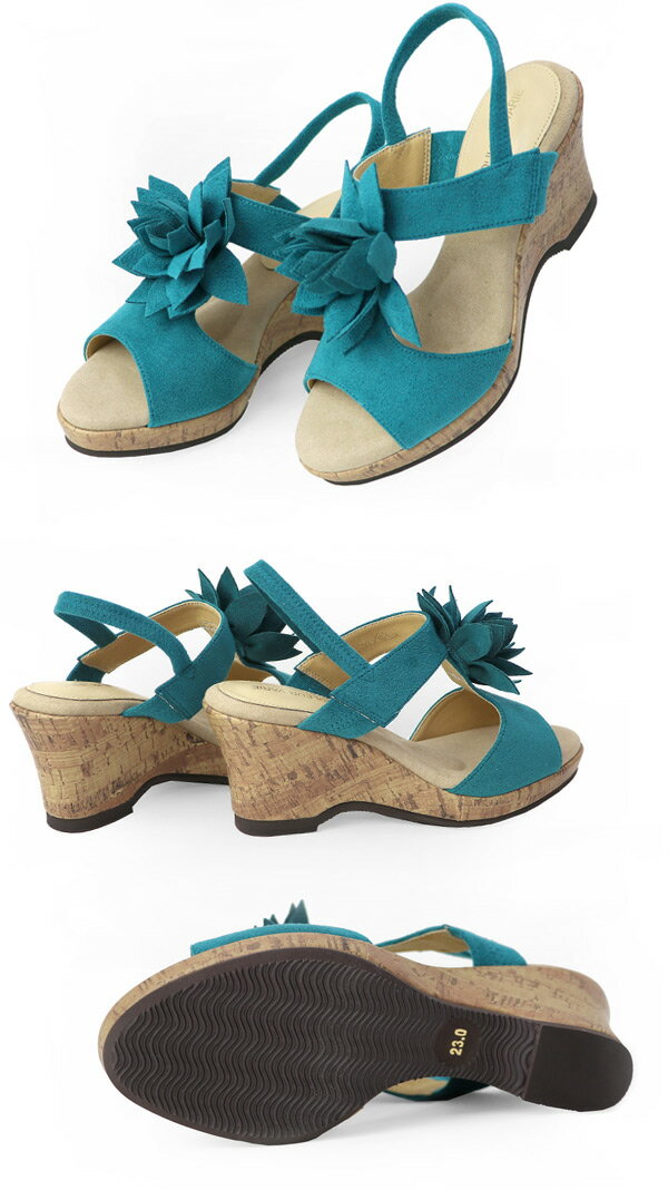 ナチュラルなコルクプリントのソールに ボリュームのあるフラワーモチーフがアクセントの 足元を華やかに演出してくれるウエッジサンダル。