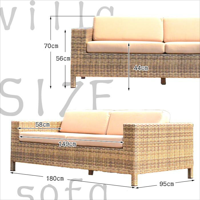 サイズ 幅:180cm 奥行き:95cm 高さ:56cm 素材 人工ラタン(高密度ポリエチレン) アルミニウム、他 製造国 インドネシア ※ソファー1点の価格です。