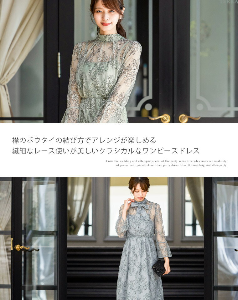 襟ボウタイレースワンピースドレス レディース サイズ 総丈(SNP~) バスト(裏地) ウエスト 袖丈 S 114cm 85cm 55cm 48cm M 115cm 92cm 62cm 49cm L 116cm 99cm 69cm 50cm LL 117cm 106cm 76cm 51cm カラー ブルーグレー / ライトグリーン / ネイビー モデル H:164 B:80 W:58 H:85 着用サイズ:M 備考 伸縮性:なし / 裏地:あり / バックウエストゴム 素材 表地:ポリエステル100% / 裏地:ポリエステル100% 生産国 中国 コメント 襟のボウタイの結び方でアレンジが楽しめる 繊細なレース使いが美しいクラシカルなワンピースドレス。