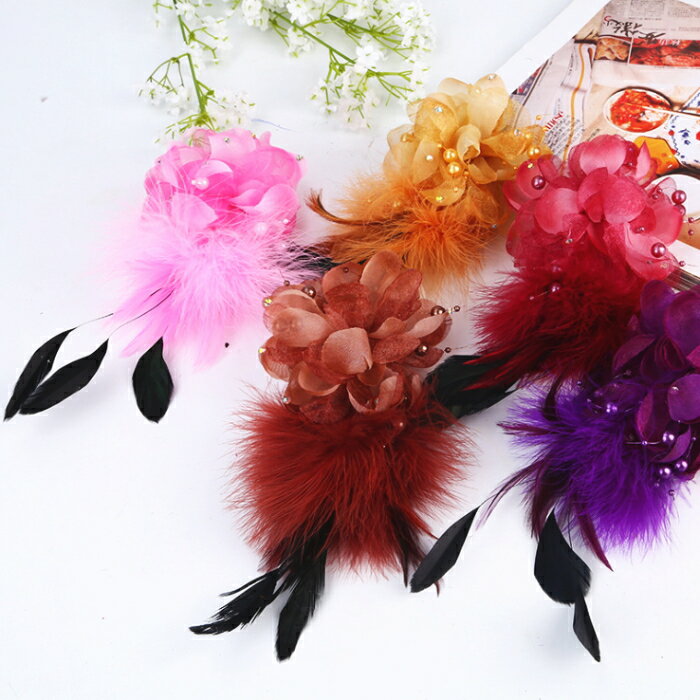 鮮やかなカラーバリエーションなので、ダンスやパーティードレス、ウェデイングドレス、着物や浴衣など和装にも、様々なシーンで大活躍! ファーやフェザー、ラインストーンなどが装飾され、豪華なコサージュです。