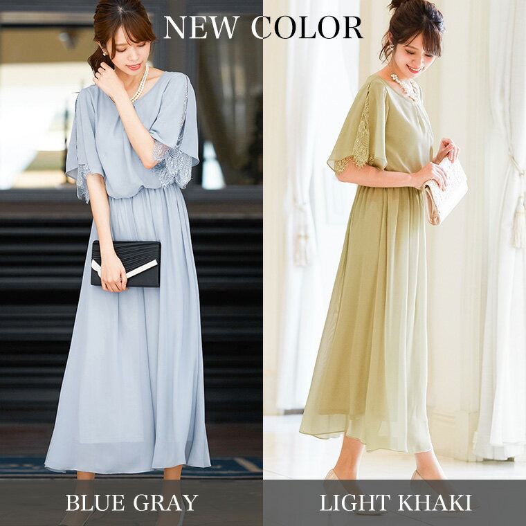 スリット入りレーススリーブロングワンピース さりげなレースが大人かわいいロングワンピースドレス。