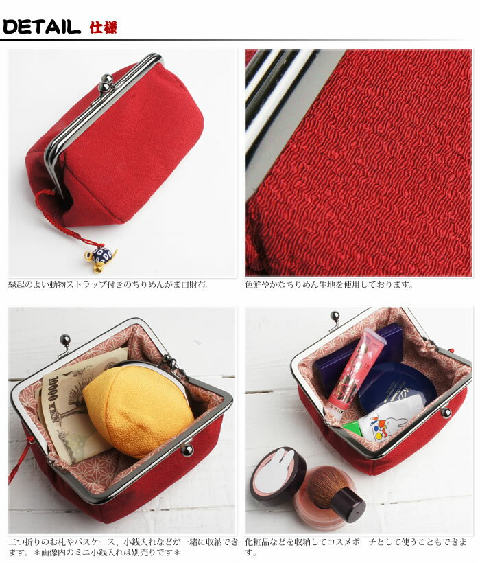 金運アップの動物ストラップ付きのちりめんがま口ポーチ 伝統文化が息づく街京都で作られた、「京くらふと」ちりめん縁起がまぐち財布、価値ある逸品です。